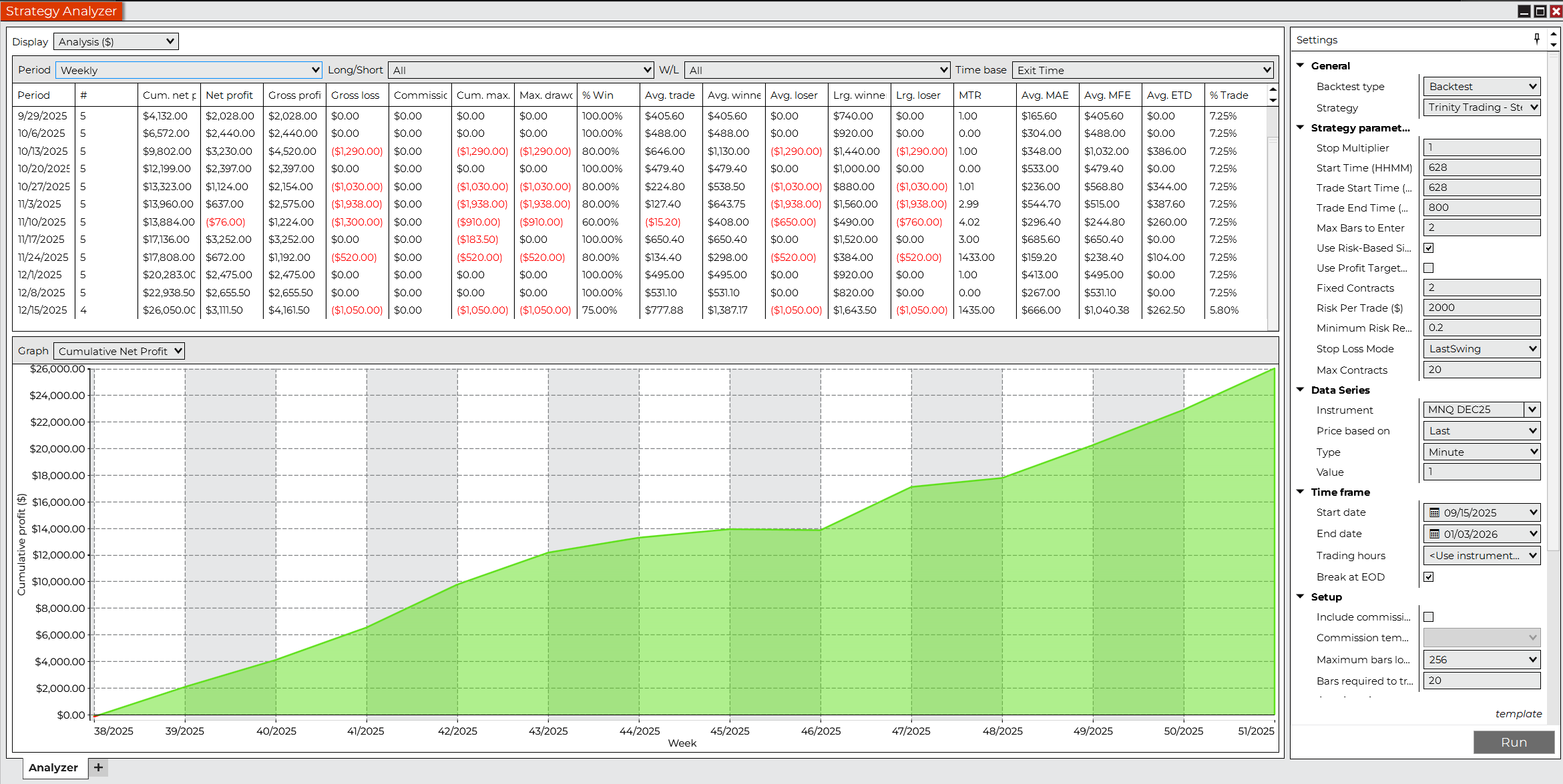 A financial dashboard displaying a strategy analysis table with weekly data, including net profit, gross profit, losses, and trade percentages, above a green line graph illustrating cumulative net profit over time.